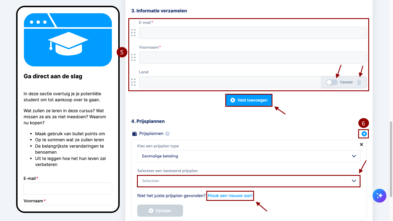 Onder Informatie verzamelen kies je welke klantgegevens je wilt opvragen (5). Klik op Veld toevoegen om indien nodig extra velden toe te voegen.