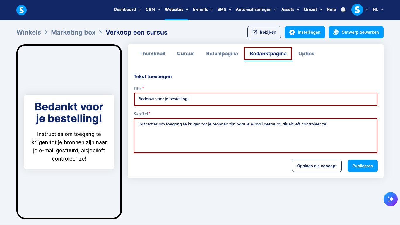 Voeg op het tabblad Bedanktpagina een titel en subtitel toe die na een aankoop worden weergegeven.