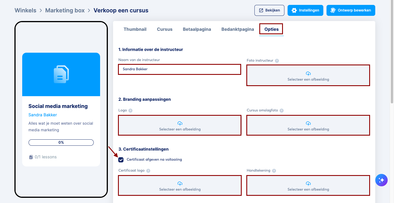 Gebruik tot slot het tabblad Opties om het instructeursprofiel, de branding (logo en omslag) en de certificaatinstellingen aan te passen.