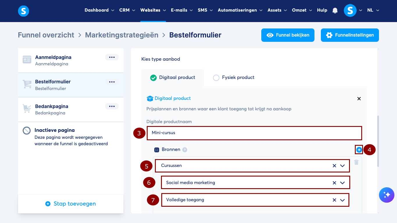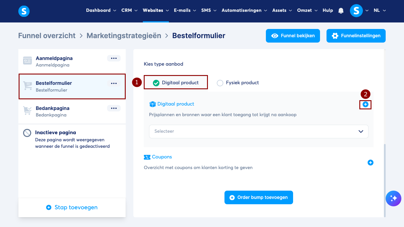 Selecteer in de stap Bestelformulier Digitaal product (1) en klik op de plusknop (+) (2).