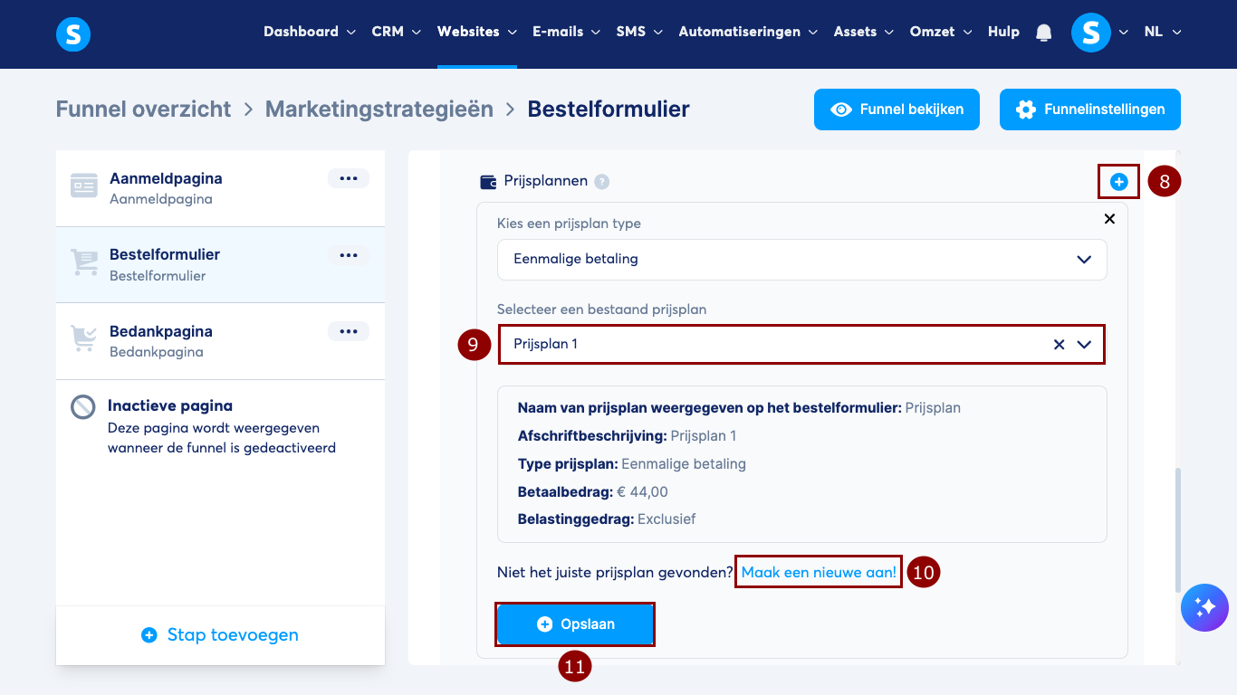 Klik op de plusknop (+) (8). Selecteer een bestaand prijsplan (9) of klik op Maak een nieuwe aan (10).